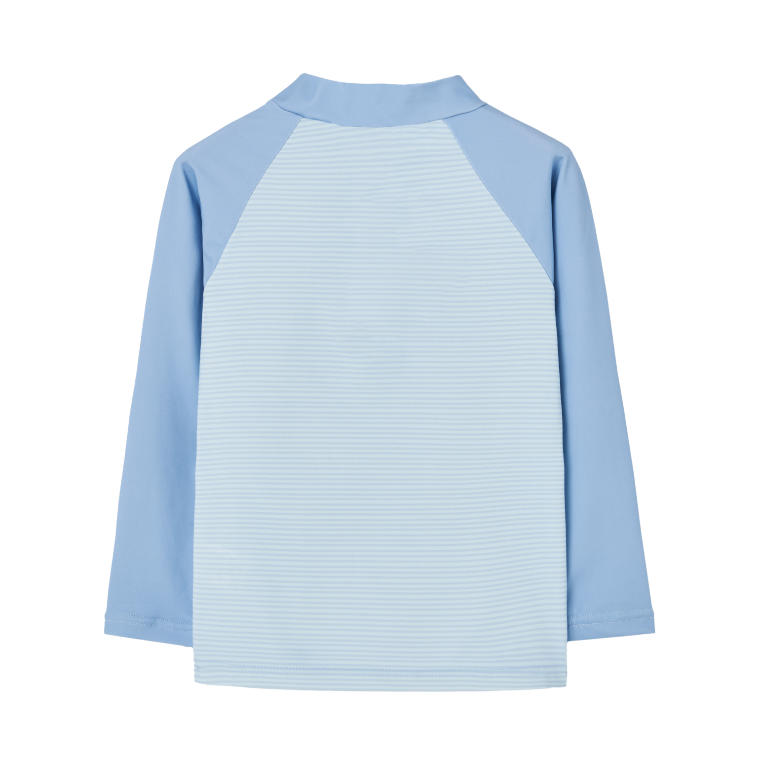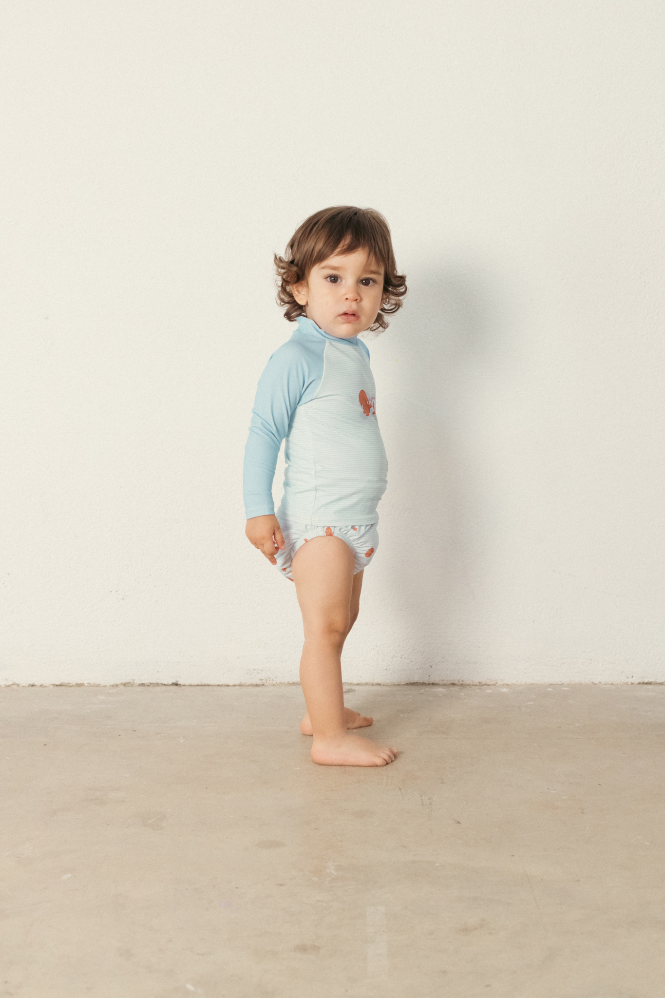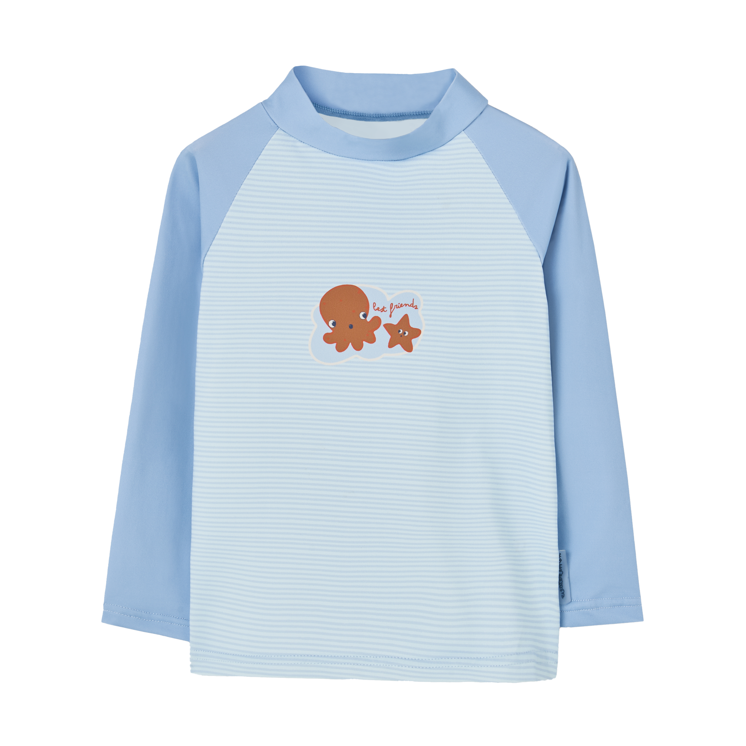 Con escote redondo y manga larga, esta prenda ofrece una cobertura cómoda y total, ideal para jugar bajo el sol. Su estampado de rayas azules y el diseño posicional de pulpo sobre un fondo azul claro le dan un look fresco, original y lleno de personalidad.