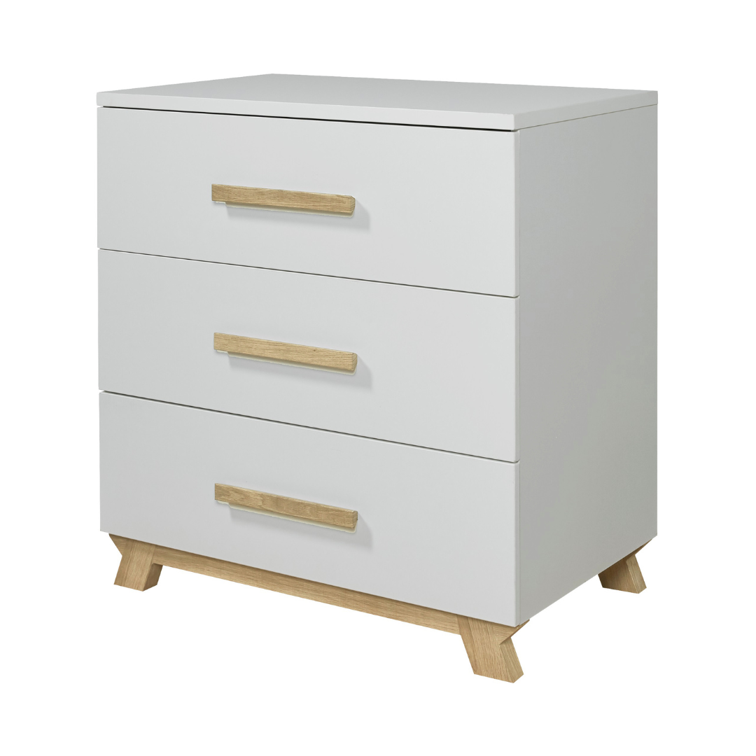El diseño de la Cómoda VENETO IKID destaca por sus líneas limpias y su estética atemporal, lo que permite integrarla fácilmente en cualquier estilo de dormitorio infantil. Gracias a su altura y distribución de los cajones, facilita la organización de ropa, pañales, accesorios y productos de higiene, manteniendo todo siempre a mano.