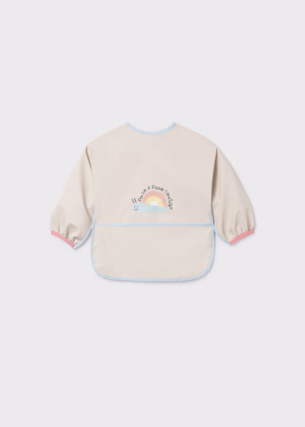 ¡Comidas sin manchas y con mucho estilo! El babero de manga larga de Mayoral es la solución definitiva para proteger la ropa de tu bebé durante la alimentación o las actividades creativas. Con un diseño tierno de un caracol y un arcoíris sobre un elegante fondo color almendra, este babero combina la máxima cobertura con un mantenimiento sencillo.