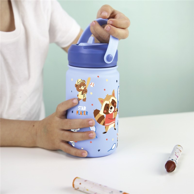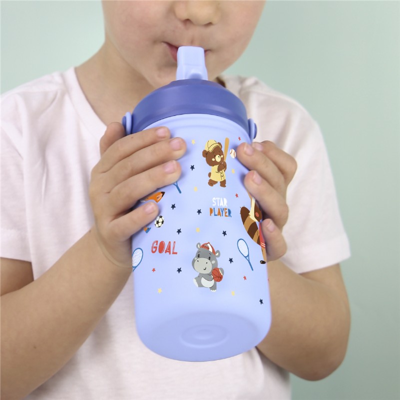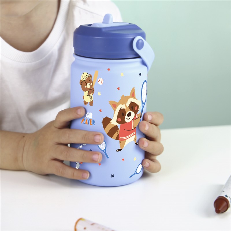 Gracias a su doble pared térmica, mantiene las bebidas frías hasta 24 horas y calientes hasta 12 horas, sin generar condensación exterior que pueda mojar mochilas o manos. Incorpora un tapón infantil con pajita integrada, fácil de usar, y un eficaz sistema antifuga que evita derrames.
